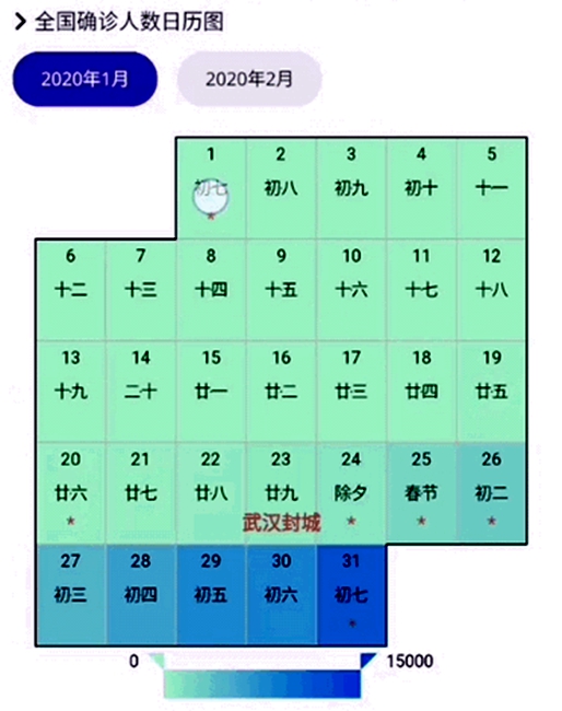 全国新冠肺炎确诊人数的日历图。日历图将每日全国新冠肺炎确诊人数与2020年1月以来与疫情相关的重大事件结合,能更直观地了解到疫情发展情况与采取的有效防控措施之间的关联。