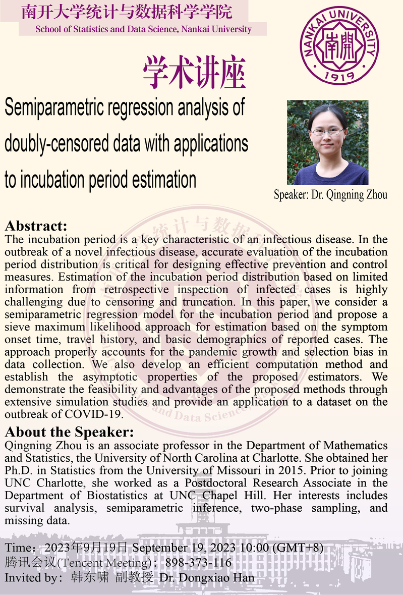 Semiparametric regression analysis of doubly-censored data with applications to incubation period estimation(Qingning Zhou)