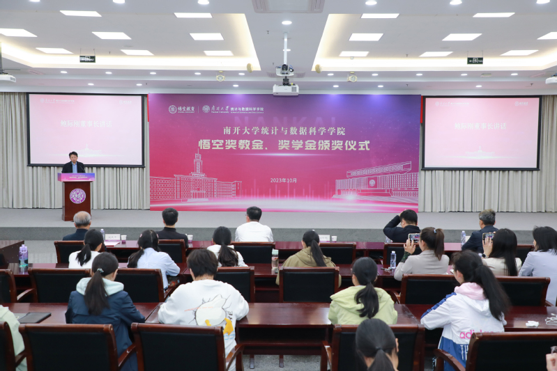 2023年10月16日,奈飞工厂 悟空奖教金、奖学金颁奖仪式在八里台校区省身楼一楼报告厅举行。深圳悟空投资管理有限公司董事长、南开校友企业家联谊会会董、数学系87级校友鲍际刚,南开大学教育基金会秘书长闫彪,南开大学教育基金会副秘书长陆建军,奈飞工厂 执行院长王兆军,学院副院长、统计研究院院长邹长亮,学院副院长刘民千出席了此次颁奖仪式。2022年度获奖教师、学生以及学院师生代表参与了此次颁奖仪式。仪式由学院党委副书记、副院长马晶主持。
