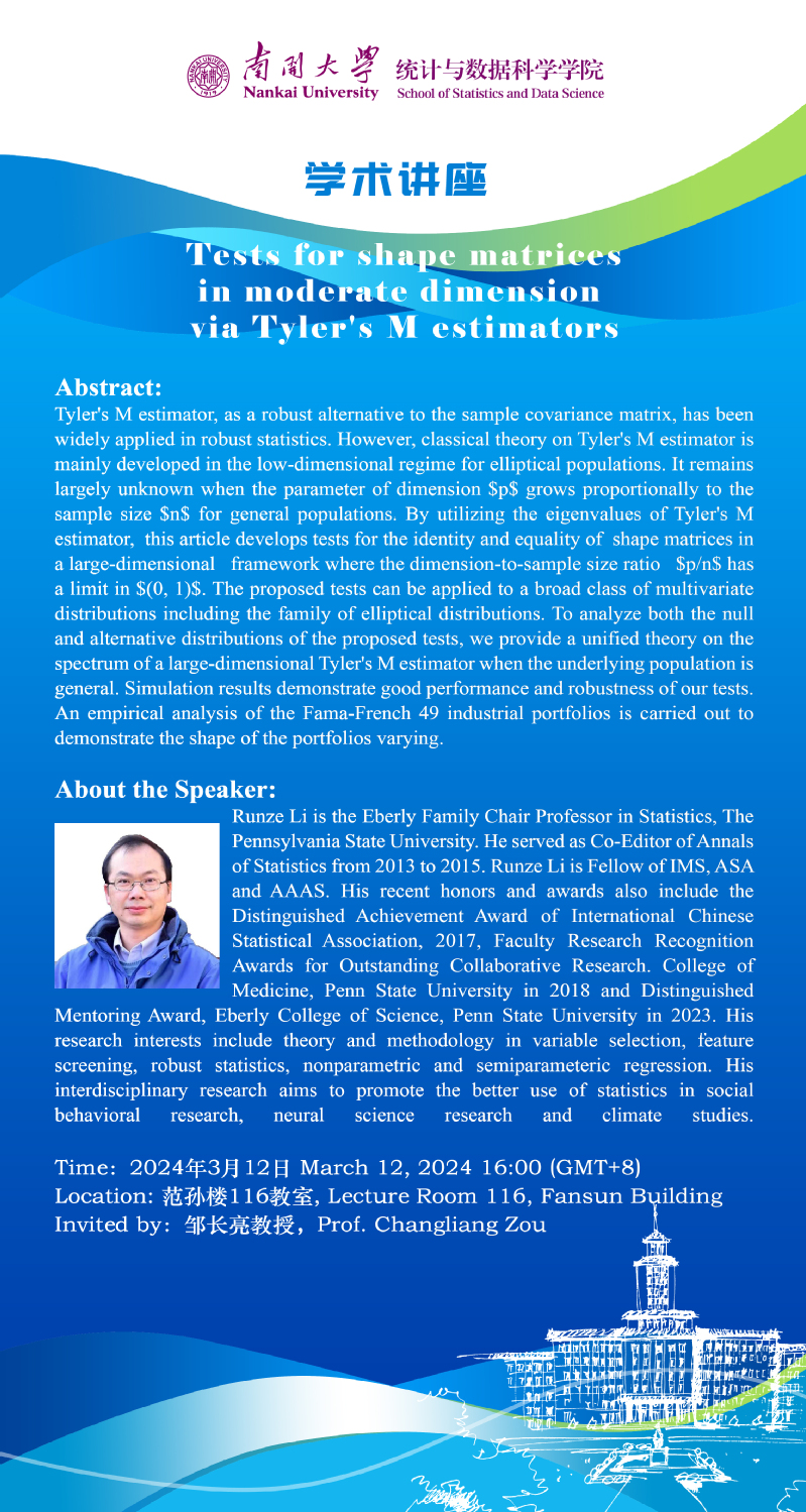 Tests for shape matrices in moderate dimension via Tyler's M estimators(李润泽)