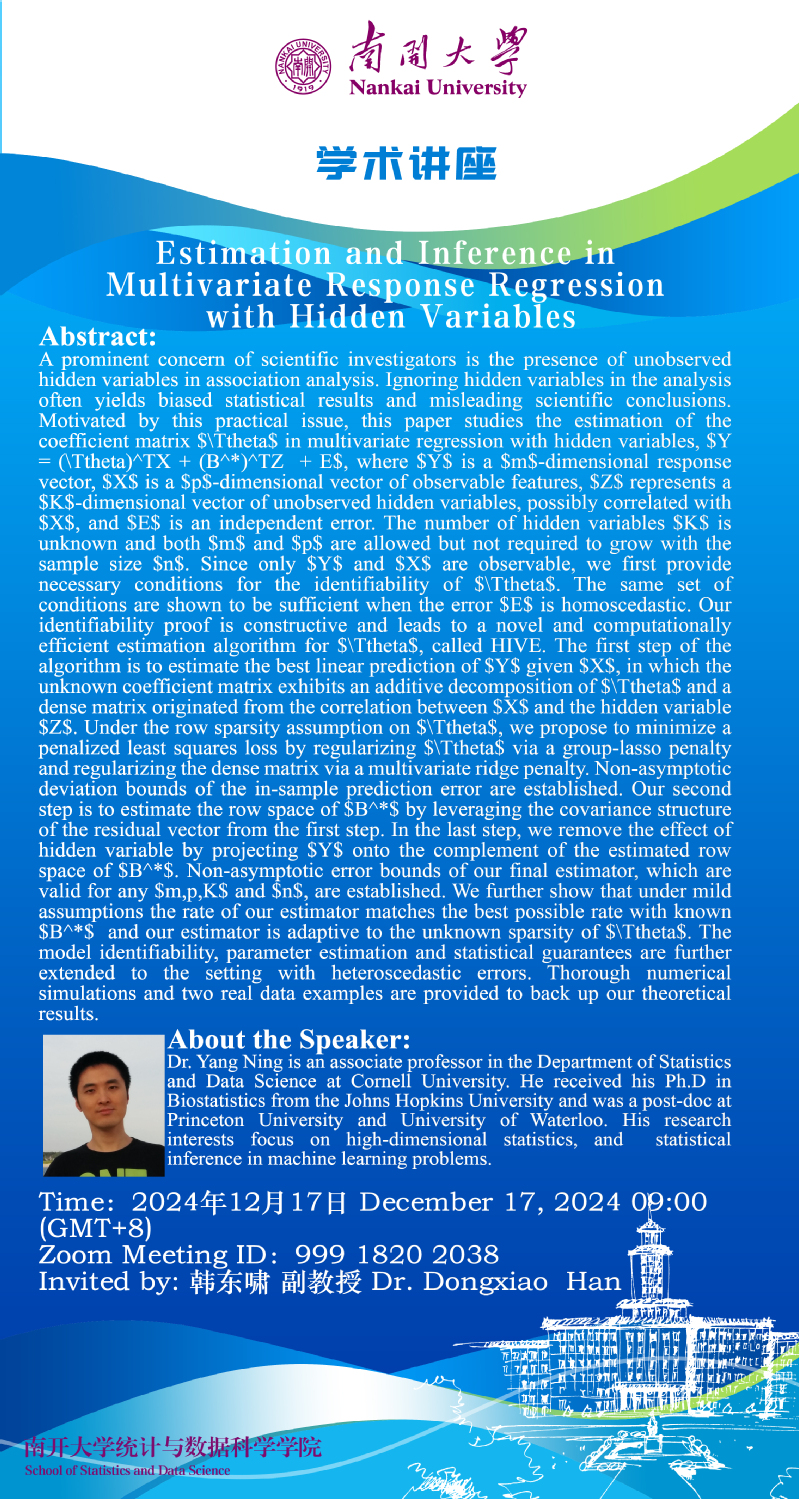 Estimation and Inference in Multivariate Response Regression with Hidden Variables(Yang Ning)