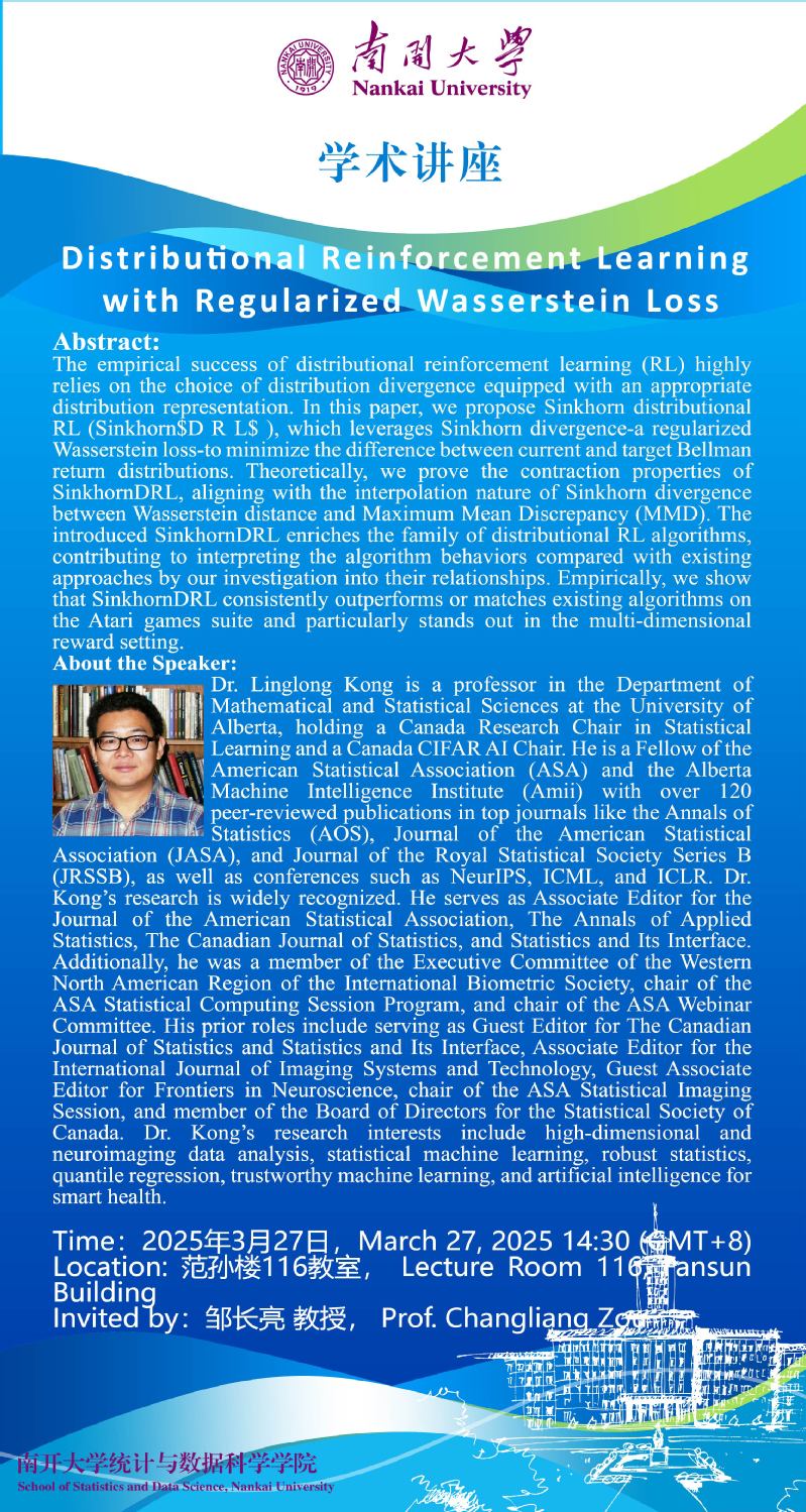 Distributional Reinforcement Learning with Regularized Wasserstein Loss(Linglong Kong)