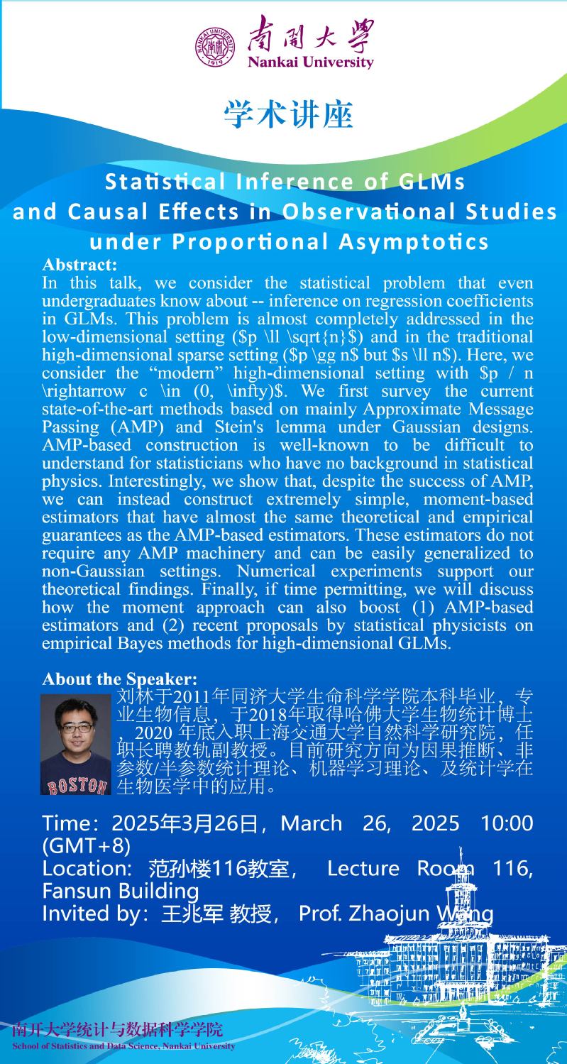 Statistical Inference of GLMs and Causal Effects in Observational Studies under Proportional Asymptotics(刘林)