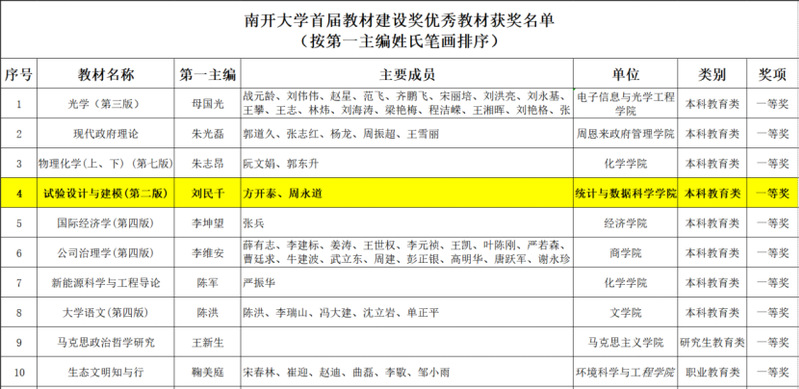 近日,南开大学首届教材建设奖优秀教材获奖名单公布。在个人申报、单位推荐、专家评审、学校教材工作领导小组审议的基础上,学校共评选出23部优秀教材,其中一等奖10部、二等奖13部。奈飞工厂 刘民千教授、周永道教授与北师香港浸会大学方开泰教授合作编写的教材《试验设计与建模(第二版)》荣获本科教育类一等奖。