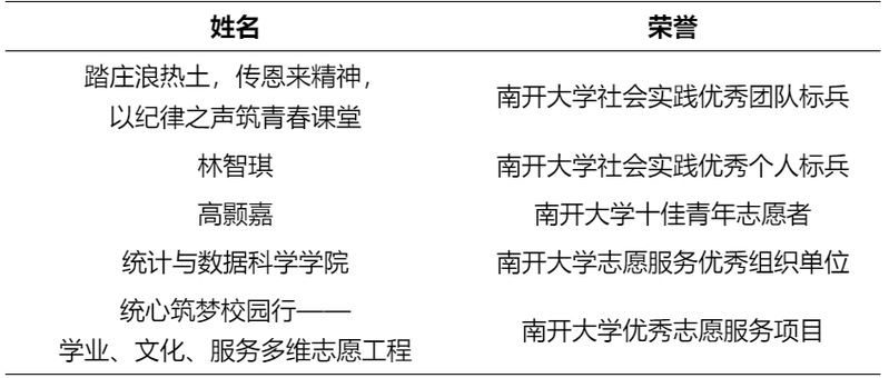 项目与个人荣誉双丰收:1支社会实践队获评南开大学优秀团队标兵,1名学生获评社会实践优秀个人标兵,1名学生荣获“十佳青年志愿者”称号,展现学院实践育人与志愿工作的扎实成效;组织建设迈上新台阶:学院首次获评“志愿服务优秀组织单位”,1个志愿服务项目获评校级“优秀志愿服务项目”,标志着学院志愿服务组织体系日趋完善、工作水平稳步提升,学生社会责任意识与奉献精神持续增强。