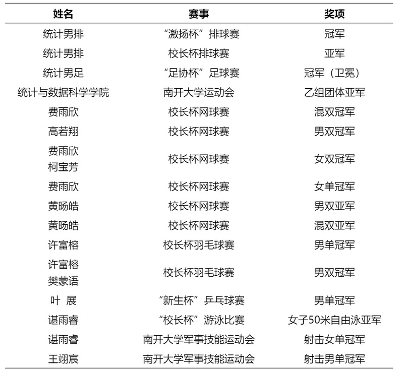 集体项目彰显团结力量:学院代表队在校运会中荣获乙组团体亚军,展现顽强拼搏的团队精神;统计男足在“足协杯”比赛中以不败战绩强势卫冕,续写荣耀传奇;统计男排在“激扬杯”男子排球赛事中勇夺冠军,在“校长杯”排球比赛中斩获亚军,尽显敢打敢拼的竞技风采。