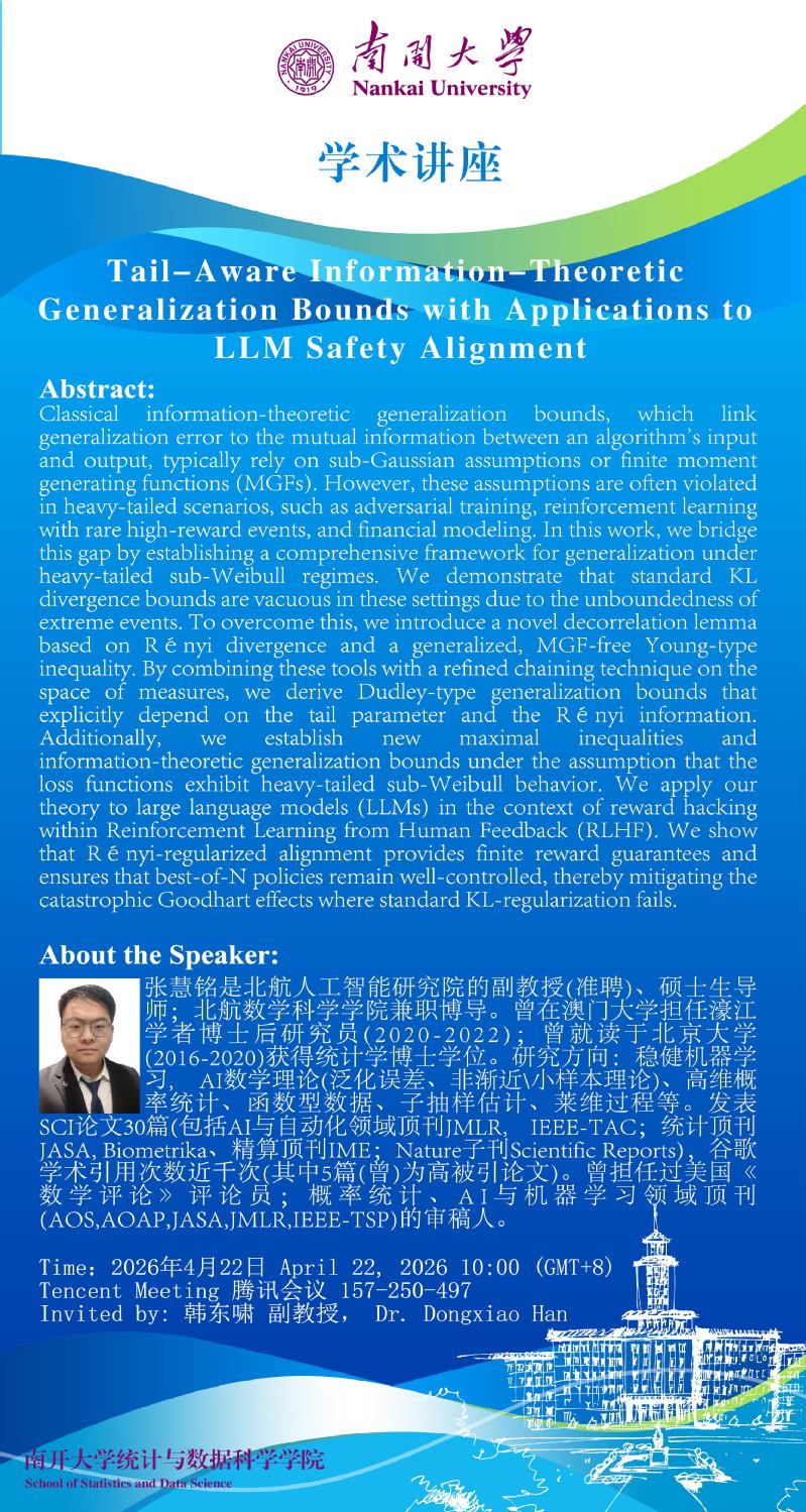 Tail-Aware Information-Theoretic Generalization Bounds with Applications to LLM Safety Alignment(张慧铭)